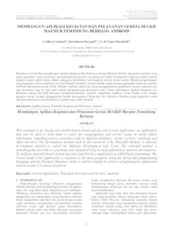 penelitian ini yaitu Rancang Bangun Aplikasi Kegiatan Dan Pelayanan Gereja Berbasis Mobile merupakan Aplikasi yang dapat digunakan untuk membantu mempermudah jemaat dan tim pelayanan dalam mendapatkan informasi terkait jadwal kegiatan seperti jadwal baptis, ibadah mingguan, pernikahan, serta kegiatan lainnya secara mudah. Pengguna juga bisa menggunakan aplikasi ini ketika ingin mendaftar pernikahan kudus. Metode pengembangan yang digunakan dalam penelitian ini yaitu Metode Waterfall, sebuah metode pengembangan perangkat lunak atau disebut Software Development Life Cycle. Metode waterfall adalah hal yang menggambarkan pendekatan secara sistematis dan juga berurutan (step by step) pada sebuah pengembangan perangkat lunak. Tahapan dengan spesifikasi kebutuhan pengguna lalu berlanjut melalui tahapan-tahapan perencanaan yaitu planning, permodelan, konstruksi, sebuah system dan penyerahan sistem kepada pengguna, dukungan pada perangkat lunak lengkap yang dihasilkan. Untuk membangun Aplikasi Kegiatan dan Pelayanan Gereja Di GKII Mazmur Temindung Berbasis Android. Diperlukan Aplikasi Visual Studio Code sebagai program utama, dengan menggunakan bahasa pemograman Javascript, dan Database Firebase yang digunakan untuk mempermudah proses pembaharuan isi aplikasi agar selalu menarik. ============================================================ This research is the Design and Development of a Mobile-Based Church Activities and Services Application is an application that can be used to help make it easier for congregations and service teams to get information related to activity schedules such as baptism schedules, weekly worship, weddings, and other activities easily. Users can also use this application when they want to register for a holy wedding. The development method used in this study is the Waterfall Method, a software development method or called the Software Development Life Cycle. The waterfall method is something that describes a systematic and sequential approach (step by step) in software development. The stages with the specification of user needs then continue through the stages of planning, namely planning, modeling, construction, a system and handing over the system to the user, support for the complete software produced. To build an Android-Based Application for Church Activities and Services in GKII Psalm Temindung. Visual Studio Code Application is required as the main program, using the Javascript programming language, and the Firebase Database which is used to make the process of updating the content of the application always interesting.