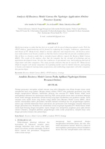 Strategi pemasaran merupakan sebuah rencana yang telah ditetapkan atau dibuat dengan tujuan untuk memperoleh hasil yang optimal. Dengan adanya analisis SWOT akan terbentuk pemasaran yang baik dengan mengevaluasi kekuatan, kelemahan, peluang, dan ancaman PT. Media Kreasi Abadi untuk meningkatkan efisisensi dan kemampuan bersaing. Pada semua pelaku bisnis harus memahami beberapa bisnis model sehingga memerlukan sebuah konsep yang dapat memberikan satu gambaran standar. Salah satunnya yaitu model bisnis yang dinilai cukup efektif yaitu Business Model Canvas (BMC). Hasil analisis menunjukkan bahwa perusahaan memiliki kekuatan teknologi dan tim pengembangan aplikasi, namun juga memiliki kelemahan biaya operasional, dan pemasaran serta kurangnya menjalin kerjasama dengan perusahaan lain. Penelitian ini memberikan solusi yang dapat digunakan PT. Media Kreasi Abadi untuk dapat bersaing dengan kompetitor sejenis dengan cara memperluas jangkauan pasar pada elemen saluran (channel), mengikuti pelatihan pengembangan usaha (value proposition), menjalin kerja sama dengan perusahan lainnya (key partnerships). ============================================================== Marketing strategy is a plan that has been set or made with the aim of obtaining optimal results. With this SWOT analysis, good marketing will be formed by evaluating the strengths, weaknesses, opportunities, and threats of PT. Media Kreasi Abadi to increase efficiency and competitiveness. All business actors must understand several business models so that they need a concept that can provide a standard picture. One of them is a business model that is considered quite effective, namely the Business Model Canvas (BMC). The results of the analysis show that the company has the strength of technology and an application development team, but also has weaknesses in operational costs, and marketing and lack of cooperation with other companies. This study provides solutions that can be used by PT. Media Kreasi Abadi to compete with similar competitors by expanding market reach in channel elements, participating in business development training (value proposition), and establishing cooperation with other companies (key partnerships).
