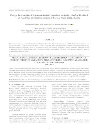 Indah, Risdiani M (2025) Penggunaan Algoritma Lexicon – Based Sentiment Analysis Untuk Analisis Feedback Mahasiswa Terhadap Sistem Informasi Akademik DI STMIK Widya Cipta Dharma. S1 Teknik Informatika thesis, STMIK Widya Cipta Dharma.