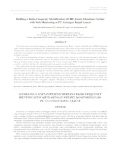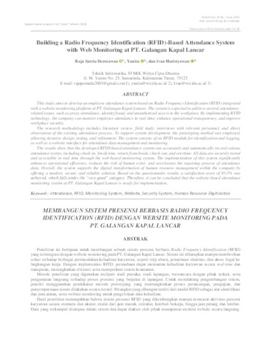 Penelitian ini bertujuan untuk membangun sebuah sistem presensi berbasis Radio Frequency Identification (RFID) yang terintegrasi dengan website monitoring pada PT. Galangan Kapal Lancar. Sistem ini diharapkan mampu memberikan solusi terhadap berbagai permasalahan kehadiran karyawan, seperti titip absen, pemalsuan identitas, dan akses ilegal ke lingkungan kerja. Dengan implementasi RFID, perusahaan dapat memantau kehadiran karyawan secara real-time dan transparan, meningkatkan efisiensi serta memperkuat sistem keamanan. Metode penelitian yang digunakan meliputi studi pustaka, studi lapangan, wawancara dengan pihak terkait, serta pengamatan langsung terhadap proses presensi yang berjalan di lapangan. Untuk mendukung pengembangan sistem, peneliti menggunakan pendekatan metode prototyping yang memungkinkan proses perancangan, pengujian, dan penyempurnaan sistem dilakukan secara iteratif. Perangkat yang dibangun terdiri dari modul RFID sebagai alat identifikasi dan pencatatan, serta website monitoring untuk pengelolaan data kehadiran. Hasil penelitian menunjukkan bahwa sistem presensi RFID yang dikembangkan mampu mencatat aktivitas presensi karyawan secara otomatis dan akurat, mulai dari jam masuk, istirahat, kembali bekerja, hingga jam pulang dan lembur. Data yang terkumpul disimpan dalam sistem dan dapat diakses oleh pihak manajemen melalui website secara langsung. Implementasi sistem ini terbukti membantu perusahaan dalam mengelola kehadiran karyawan secara lebih efektif, mengurangi risiko kesalahan pencatatan, serta mempercepat proses pelaporan data kehadiran. Secara keseluruhan, sistem ini mendukung upaya digitalisasi manajemen sumber daya manusia di perusahaan dengan menghadirkan solusi yang modern, aman, dan terpercaya. Dan dari hasil data kuesioner yang telah dilakukan maka telah diperoleh presentase nilai sebesar 93,3% yang termasuk kedalam kriteria sangat baik. Sehingga dapat disimpulkan bahwa website monitoring presensi pada PT. Galangan Kapal Lancar sudah dapat digunakan. ============================================================ This study aims to develop an employee attendance system based on Radio Frequency Identification (RFID) integrated with a website monitoring platform at PT. Galangan Kapal Lancar. The system is expected to address several attendance-related issues, such as proxy attendance, identity fraud, and unauthorized access to the workplace. By implementing RFID technology, the company can monitor employee attendance in real time, enhance operational transparency, and improve workplace security. The research methodology includes literature review, field study, interviews with relevant personnel, and direct observation of the existing attendance process. To support system development, the prototyping method was employed, allowing iterative design, testing, and refinement. The system consists of an RFID module for identification and logging, as well as a website interface for attendance data management and monitoring. The results show that the developed RFID-based attendance system can accurately and automatically record various attendance events, including check-in, break time, return from break, check-out, and overtime. All data are securely stored and accessible in real time through the web-based monitoring system. The implementation of this system significantly enhances operational efficiency, reduces the risk of human error, and accelerates the reporting process of attendance data. Overall, the system supports the digital transformation of human resource management within the company by offering a modern, secure, and reliable solution. Based on the questionnaire results, a satisfaction score of 93.3% was achieved, which falls under the “very good” category. Therefore, it can be concluded that the website-based attendance monitoring system at PT. Galangan Kapal Lancar is ready for implementation.