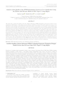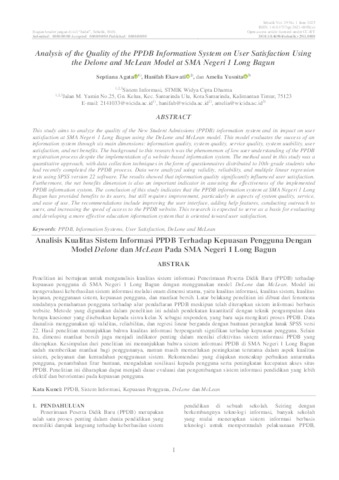 Penelitian ini bertujuan untuk menganalisis kualitas sistem informasi Penerimaan Peserta Didik Baru (PPDB) terhadap kepuasan pengguna di SMA Negeri 1 Long Bagun dengan menggunakan model DeLone dan McLean. Model ini mengevaluasi keberhasilan sistem informasi melalui enam dimensi utama, yaitu kualitas informasi, kualitas sistem, kualitas layanan, penggunaan sistem, kepuasan pengguna, dan manfaat bersih. Latar belakang penelitian ini dibuat dari fenomena rendahnya pemahaman pengguna terhadap alur pendaftaran PPDB meskipun telah diterapkan sistem informasi berbasis website. Metode yang digunakan dalam penelitian ini adalah pendekatan kuantitatif dengan teknik pengumpulan data berupa kuesioner yang disebarkan kepada siswa kelas X sebagai responden, yang baru saja mengikuti proses PPDB. Data dianalisis menggunakan uji validitas, reliabilitas, dan regresi linear berganda dengan bantuan perangkat lunak SPSS versi 22. Hasil penelitian menunjukkan bahwa kualitas informasi berpengaruh signifikan terhadap kepuasan pengguna. Selain itu, dimensi manfaat bersih juga menjadi indikator penting dalam menilai efektivitas sistem informasi PPDB yang diterapkan. Kesimpulan dari penelitian ini menunjukkan bahwa sistem informasi PPDB di SMA Negeri 1 Long Bagun sudah memberikan manfaat bagi penggunanya, namun masih memerlukan peningkatan terutama dalam aspek kualitas sistem, pelayanan dan kemudahan penggunaan sistem. Rekomendasi yang diajukan mencakup perbaikan antarmuka pengguna, penambahan fitur bantuan, mengadakan sosilisasi kepada pengguna serta peningkatan kecepatan akses situs PPDB. Penelitian ini diharapkan dapat menjadi dasar evaluasi dan pengembangan sistem informasi pendidikan yang lebih efektif dan berorientasi pada kepuasan pengguna. ============================================================ This study aims to analyze the quality of the New Student Admissions (PPDB) information system and its impact on user satisfaction at SMA Negeri 1 Long Bagun using the DeLone and McLean model. This model evaluates the success of an information system through six main dimensions: information quality, system quality, service quality, system usability, user satisfaction, and net benefits. The background to this research was the phenomenon of low user understanding of the PPDB registration process despite the implementation of a website-based information system. The method used in this study was a quantitative approach, with data collection techniques in the form of questionnaires distributed to 10th-grade students who had recently completed the PPDB process. Data were analyzed using validity, reliability, and multiple linear regression tests using SPSS version 22 software. The results showed that information quality significantly influenced user satisfaction. Furthermore, the net benefits dimension is also an important indicator in assessing the effectiveness of the implemented PPDB information system. The conclusion of this study indicates that the PPDB information system at SMA Negeri 1 Long Bagun has provided benefits to its users, but still requires improvement, particularly in aspects of system quality, service, and ease of use. The recommendations include improving the user interface, adding help features, conducting outreach to users, and increasing the speed of access to the PPDB website. This research is expected to serve as a basis for evaluating and developing a more effective education information system that is oriented toward user satisfaction.