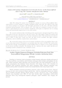 Penelitian ini bertujuan untuk menganalisis tingkat kepuasan pelanggan terhadap pelayanan di Toko Enoysnofficial, yang berfokus pada kebutuhan pelanggan dalam kategori perlengkapan ibu dan anak. Subjek penelitian adalah pelanggan atau konsumen aktif yang telah bertransaksi di toko ini, dengan pengumpulan data dilakukan selama Desember 2024 hingga Januari 2025. Penelitian ini dilakukan untuk menjawab kebutuhan toko dalam memahami tingkat kepuasan pelanggan yang berperan penting dalam menciptakan loyalitas dan mempertahankan daya saing di pasar online. Metode penelitian mencakup penyebaran kuesioner online melalui Google Form, observasi langsung ke toko, serta wawancara dengan pemilik toko. Studi ini menerapkan analisis uji validitas dan uji reabilitas kemudian dihitung dengan metode Customer Satisfaction Index (CSI) kemudian software yang digunakan yaitu SPSS 25 dari hasil tersebut dapat menunjukkan atribut-atribut pelayanan utama yang memengaruhi kepuasan pelanggan, seperti keandalan, daya tanggap, dan jaminan. Hasil dari analisis tingkat kepuasan pelanggan toko enoysnofficial terhadap pelayanan dari pihak toko dengan metode CSI adalah sangat puas di mana memperoleh hasil sebesar 93,68%. Hasil penelitian ini memberikan rekomendasi strategis kepada Toko Enoysnofficial untuk meningkatkan kualitas pelayanan, dengan fokus pada atribut-atribut prioritas yang diidentifikasi. Temuan dapat menjadi referensi bagi penelitian lain yang berfokus pada evaluasi kepuasan pelanggan di sektor e-commerce. ============================================================ Study This aiming For analyze level satisfaction customer to service at Enoysnofficial Store, which focuses on needs customer in category equipment mother and child. The subjects of the study were active customers or consumers who had made transactions at this store, with data collection conducted during December 2024 to January 2025. This study was conducted to answer the store's needs in understanding the level of customer satisfaction which plays an important role in creating loyalty and maintaining competitiveness in the online market. The research method includes distributing online questionnaires through Google Form, direct observation to the store, and interviews with store owners. This study applies validity test analysis and reliability test and then calculated by the Customer Satisfaction Index (CSI) method then the software used is SPSS 25 from these results can show the main service attributes that affect customer satisfaction, such as reliability, responsiveness, and assurance. The result of the analysis of the level of customer satisfaction of the enoysnofficial shop on the service of the shop with the CSI method is very satisfied where the result is 93.68%. The results of this study provide strategic recommendations to Enoysnofficial Stores to improve service quality, focusing on the priority attributes identified. The findings can be a reference for other studies that focus on evaluating customer satisfaction in the e-commerce sector.