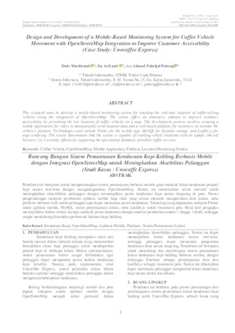 Bisnis kopi keliling menjadi salah satu inovasi dalam industri kuliner yang mengandalkan mobilitas tinggi. Namun, tantangan utama yang dihadapi adalah sulitnya pelanggan mengetahui lokasi kendaraan secara Real-time. Penelitian ini bertujuan untuk merancang dan membangun sistem pemantauan kendaraan kopi keliling berbasis mobile dengan integrasi OpenStreetMap, guna meningkatkan aksesibilitas pelanggan terhadap layanan. Metode yang digunakan dalam penelitian ini adalah metode pengembangan sistem model Waterfall, yang mencakup analisis kebutuhan, perancangan sistem, implementasi, pengujian, dan evaluasi. Sistem ini dikembangkan menggunakan Flutter sebagai aplikasi mobile, Leaflet.js dan PHP untuk aplikasi web pelanggan, serta Database sebagai media transmisi data lokasi secara Real-time tanpa menyimpan riwayat lokasi. Rider menggunakan smartphone Android sebagai GPS tracker untuk mengirimkan posisi kendaraan ke server. Hasil dari penelitian ini adalah sistem pemantauan lokasi kendaraan kopi keliling yang dapat diakses melalui tautan web tanpa perlu mengunduh aplikasi tambahan. ============================================================== Mobile coffee businesses have become one of the culinary innovations that rely heavily on high mobility. However, a major challenge lies in the difficulty for customers to track the vehicle’s location in Real-time. This study aims to design and develop a mobile-based monitoring system for coffee vehicles integrated with OpenStreetMap, in order to improve customer accessibility. The method used in this research is the Waterfall model system development method, which includes requirements analysis, system design, implementation, Testing, and evaluation. This system was developed using Flutter for the mobile application, Leaflet.js and PHP for the customer web application, and the Database as a medium for transmitting Real-time location data without storing location history. Riders use Android smartphones as GPS trackers to send vehicle positions to the server. The result of this research is a Real-time vehicle monitoring system that can be accessed via a web link without requiring customers to install any additional applications.