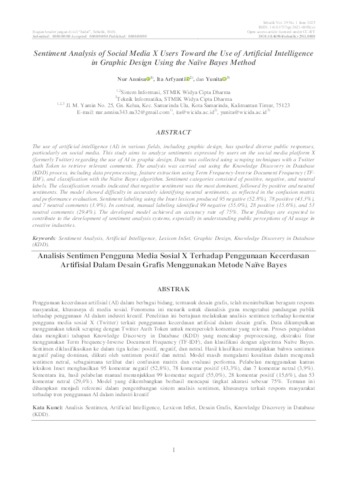 Penggunaan kecerdasan artifisial (AI) dalam berbagai bidang, termasuk desain grafis, telah menimbulkan beragam respons masyarakat, khususnya di media sosial. Fenomena ini menarik untuk dianalisis guna mengetahui pandangan publik terhadap penggunaan AI dalam industri kreatif. Penelitian ini bertujuan melakukan analisis sentimen terhadap komentar pengguna media sosial X (Twitter) terkait penggunaan kecerdasan artifisial dalam desain grafis. Data dikumpulkan menggunakan teknik scraping dengan Twitter Auth Token untuk memperoleh komentar yang relevan. Proses pengolahan data mengikuti tahapan Knowledge Discovery in Database (KDD) yang mencakup preprocessing, ekstraksi fitur dengan TF-IDF, dan klasifikasi menggunakan algoritma Naïve Bayes. Sentimen diklasifikasikan ke dalam tiga kelas: positif, negatif, dan netral. Hasil klasifikasi menunjukkan bahwa sentimen negatif paling dominan, diikuti oleh sentimen positif dan netral. Model masih mengalami kesulitan dalam mengenali sentimen netral, sebagaimana terlihat dari confusion matrix dan evaluasi performa. Pelabelan menggunakan kamus lexicon Inset menghasilkan 9 komentar negatif (52,8%), 78 positif (43,3%), dan 7 netral (3,9%). Sementara itu, hasil pelabelan manual menunjukkan 99 komentar negatif (55,0%), 28 positif (15,6%), dan 53 netral (29,4%). Model yang dikembangkan mencapai akurasi sebesar 75%. Temuan ini diharapkan menjadi referensi dalam pengembangan sistem analisis sentimen, khususnya terkait respons masyarakat terhadap tren penggunaan AI dalam industri kreatif. ============================================================ The use of artificial intelligence (AI) in various fields, including graphic design, has sparked diverse responses from the public, particularly on social media. This phenomenon is worth analyzing to understand public perceptions of AI usage in the creative industry. This study aims to conduct sentiment analysis on user comments from the social media platform X (formerly Twitter) regarding the use of artificial intelligence in graphic design. Data was collected using scraping techniques with a Twitter Auth Token to obtain relevant comments. The data processing followed the stages of Knowledge Discovery in Database (KDD), including preprocessing, feature extraction using TF-IDF, and classification using the Naïve Bayes algorithm. Sentiment labels were divided into three categories: positive, negative, and neutral. The classification results showed that negative sentiment was the most dominant, followed by positive and neutral sentiments. The model struggled to accurately detect neutral sentiments, as indicated by the confusion matrix and performance evaluation. Labeling using the Inset lexicon dictionary resulted in 95 negative comments (52.8%), 78 positive (43.3%), and 7 neutral (3.9%). Meanwhile, manual labeling yielded 99 negative comments (55.0%), 28 positive (15.6%), and 53 neutral (29.4%). The developed model achieved an accuracy of 75%. These findings are expected to serve as a reference for developing sentiment analysis systems, particularly in understanding public responses to the growing use of AI in creative industries.